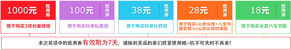 ③抵用券只用于購買相應班次、書籍、套餐,有效期為7天內支付有效,且每張現金券僅限使用一次,不支持累計領取和使用。