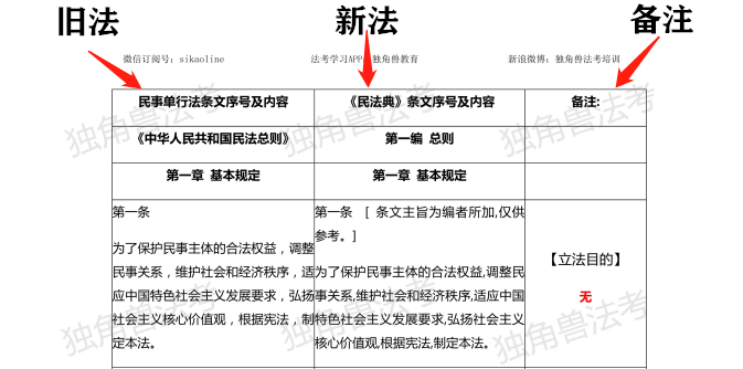 《民法典》通過之后,獨角獸法考教學教研部立即開始著手研究最新變化,對比現行九部民事單行法及其相關司法解釋,總結“民法典(全文)新舊增刪對比表”并添加“條文主旨”,應該是目前全網最全的一個對比表,分享給2020年法考考生!我們還整理了如下內容: