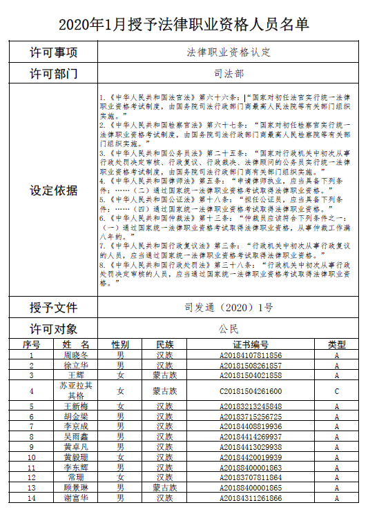 1.2020年1月授予法律職業資格14人