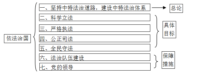 | 1.建設中國特色社會主義法治體系 | 在中國共產黨領導下,堅持中國特色社會主義制度,貫徹中國特色社會主義法治理論,形成完備的法律規范體系、高效的法治實施體系、嚴密的法治監督體系、有力的法治保障體系,形成完善的黨內法規體系。(五個體系) | ||