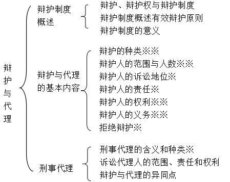 考點(diǎn)提示 辯護(hù)人的范圍、權(quán)利、義務(wù),拒絕辯護(hù),委托辯護(hù)的時間,應(yīng)當(dāng)指定辯護(hù)的情形等知識點(diǎn)是非常重要的。【知識體系】