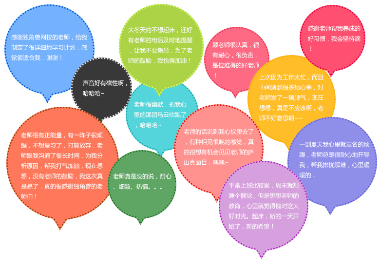 獨(dú)角獸網(wǎng)校根據(jù)網(wǎng)絡(luò)學(xué)習(xí)自身特點(diǎn),針對(duì)學(xué)員在學(xué)習(xí)過(guò)程中常出現(xiàn)的自我否定、懈怠、“破罐子破摔”等情形,特別制定了有特色的督導(dǎo)學(xué)習(xí)服務(wù)。由班主任根據(jù)課程規(guī)劃及學(xué)員自身學(xué)習(xí)安排,綜合進(jìn)行督導(dǎo)學(xué)習(xí)服務(wù)。