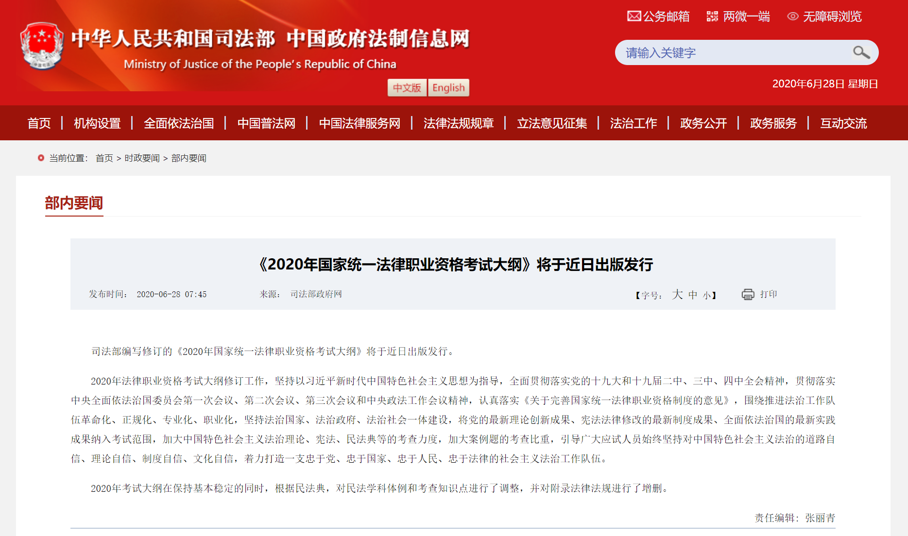 司法部編寫修訂的《2020年國家統一法律職業資格考試大綱》將于近日出版發行。
