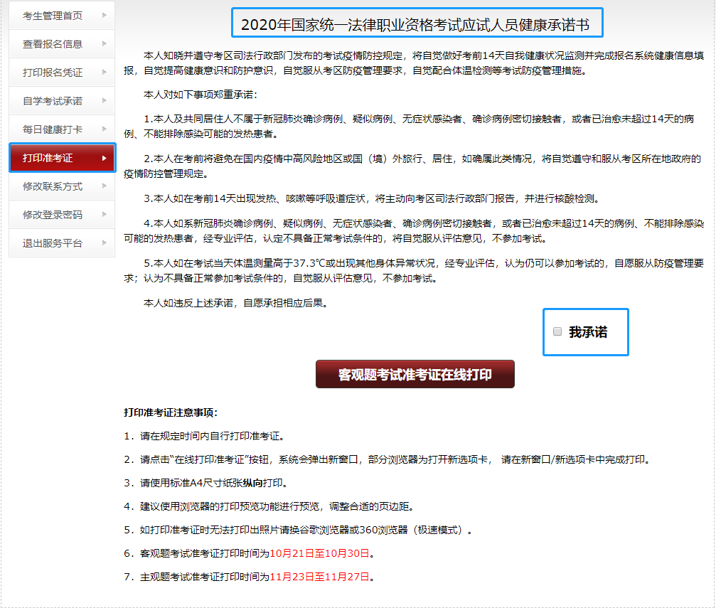 3.登錄后,在左側菜單中找到打印準考證,按照系統提示簽署健康承諾書。